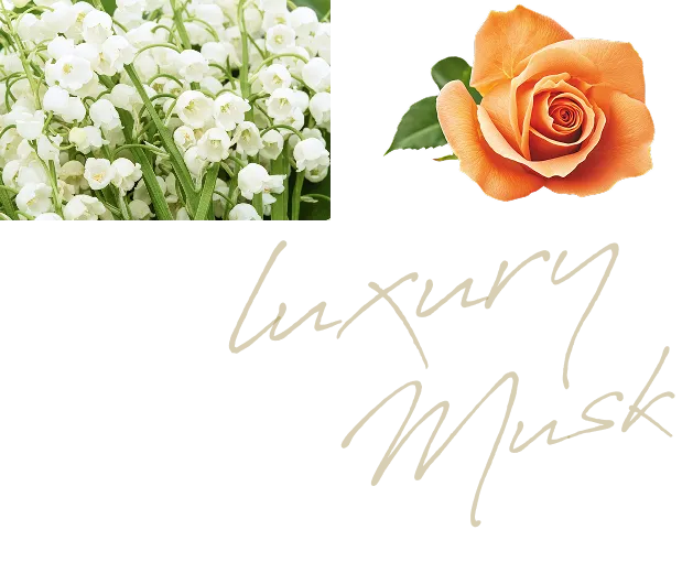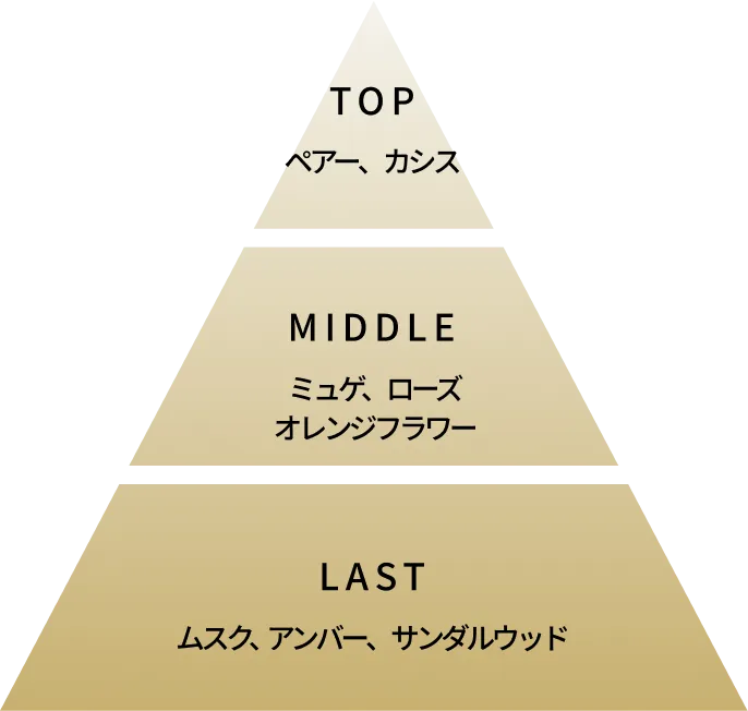 可憐なペアーと清楚なミュゲ、気品のあるローズが華やかに香り、温かみのあるムスクとアンバーが上質な余韻を演出する優雅な香りです。